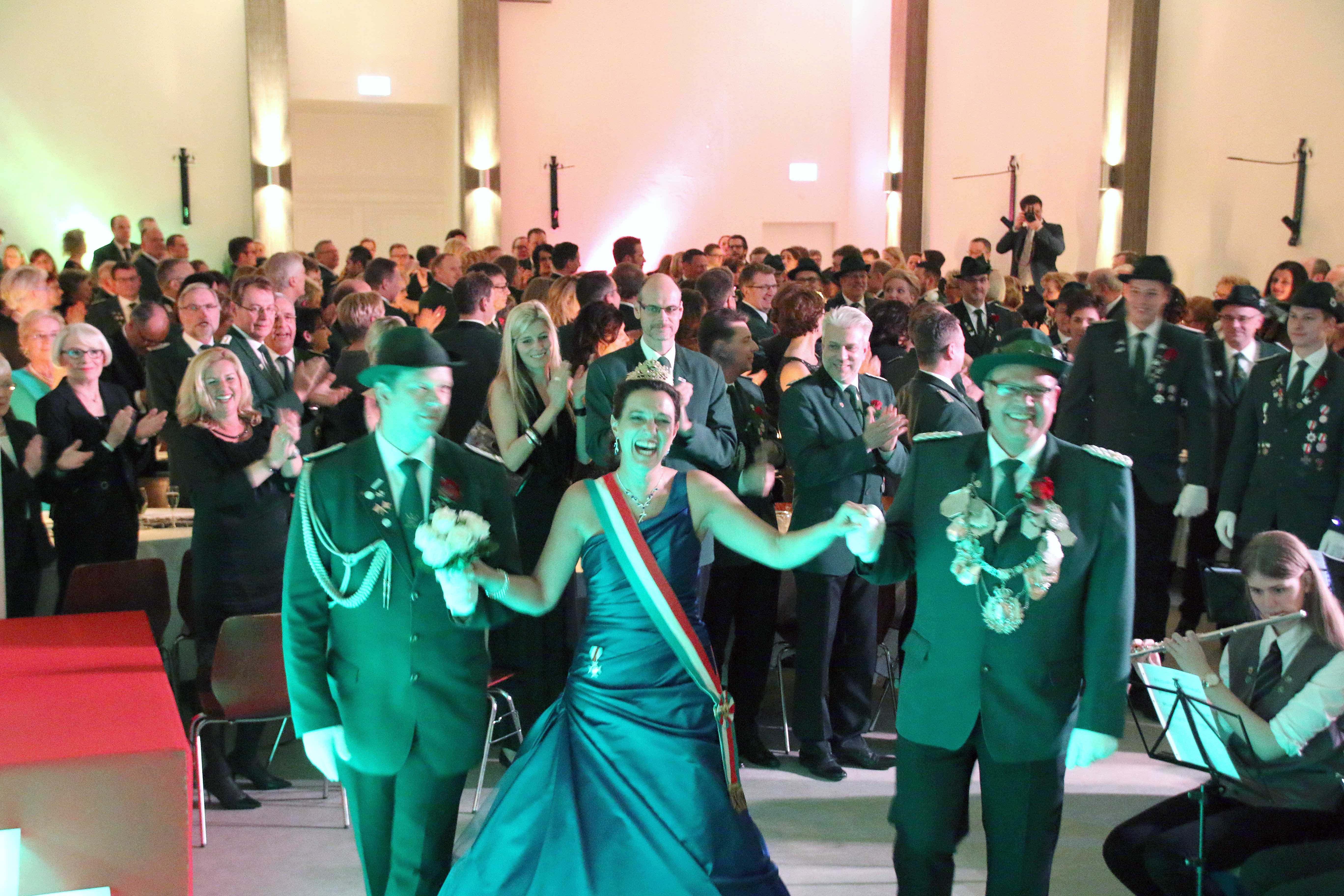 LIPPSTADT ? „Es ist ein unbeschreibliches Jahr“, sagte König Andreas Busch und schickte – sichtlich bewegt – ein großes Dankeschön an die 400 Schützen des Lippstädter Schützenvereins, die am Samstagabend zum Winterball in die Festhalle an der Bellevue gekommen waren. „Ihr macht dieses Jahr für uns zu etwas ganz Besonderem.“ Zum ersten Schützen-Höhepunkt 2016 wurde für das amtierende Königspaar der rote Teppich ausgerollt. Zur Musik des Blasorchesters Hellinghausen und des Tambourcorps des Lippstädter Schützenvereins zogen die „Royals“, Andreas und Heike Busch, begleitet von ihrem Hofstaat in die stilvoll dekorierte und erleuchtete Festhalle ein. Der König nutze die Gelegenheit, um den Schützen sehr unterhaltsam vom Beginn einer „unglaublichen Geschichte“ zu erzählen: dem Tag, an dem er mit Patrone 232 den Adler abschoss. „Wir haben Geschichte geschrieben, jeder von euch schreibt an der Geschichte des Lippstädter Schützenvereins mit“, sagte Busch. Das „wunderbare Königspaar“ lobte Oberst Toni Rösch in seiner Rede. Seine Idee: „Der Lippstädter Schützenverein stellt die Königspaare zur Verfügung und Deutschland bekäme eine konstitutionelle Monarchie.“ Die „herrliche, alternative Lösung“ – ein „wunderbares Aushängeschild“ – brächte auch einen weiteren Vorteil: der Winterball könne gleichzeitig der Neujahrsempfang sein, „und wir könnten, ohne ein schlechtes Gewissen zu haben, ausschlafen“. Bürgermeister Christof Sommer drohte mit einem Augenzwinkern: „Falls morgen einer fehlt, lese ich die Neujahrsansprache beim Winterball 2017 einfach nochmal vor.“ Aber erstmal müsse der geschäftsführende Vorstand mit „seinen Astralkörpern“ ran: Bei der Einweihung von Work-Out-Sportgeräten für Jugendliche am Jahnplatz, in die der Tombola-Erlös investiert werden soll.