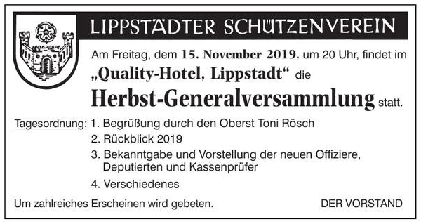 Am Freitag, dem 15.November 2019, um 20:00 Uhr, findet im "Quality-Hotel Lippstadt" die Herbst-Generalversammlung statt.