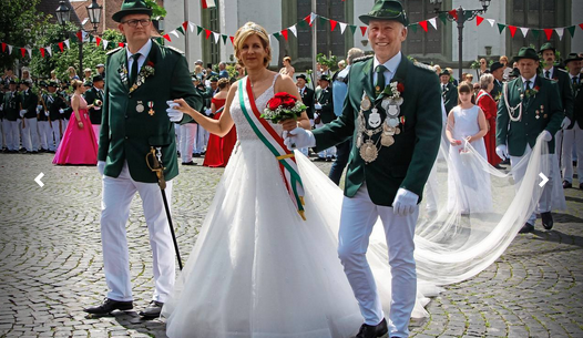Lippstadt – Oberst Prof. Dr. Sebastian Verhoeven freute sich über dieses schöne Bild unter strahlend blauem Himmel. Er begrüßte mit herzlichen Worten das amtierende Königspaar Thomas Rowlin und Claudia Falkenstein. Die Königin begeisterte die Menge in einer schneeweißen perlenbestickten Robe mit einer mehrere Meter langen Schleppe, die von den Prinzessinnen Anni und Hannah getragen wurde. Mit dabei Kronprinz Markus Patzke, Zepterprinz Olaf Beckmann und Jungschützenkönig Lars Hillebrand. Und natürlich der eindrucksvolle Hofstaat unter der Führung von Adjutant Sigwart Rinke.