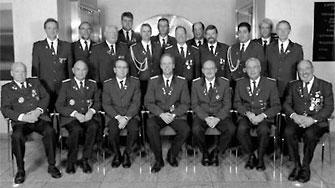 Vordere Reihe: Friedhelm Brennecke (Ehrenoberst), Heinz Herting (Ehrenmajor), Klaus Daccache (Rendant), Michael Girke (Oberst), Andreas Krabel (Major), Eckhard Dönne (Hauptmann und Schriftführer), Günter Schmidt (Ehrenmajor)