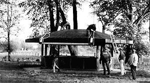 | Der 1986 errichtete Pavillon der 2. Kompanie wird an seinen neuen Platz gebracht. |